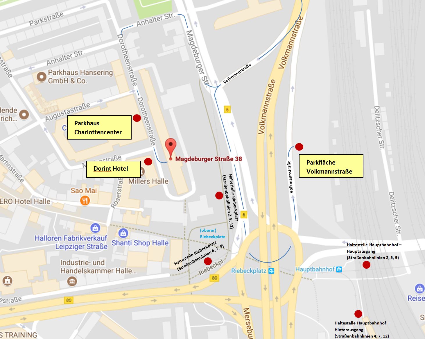 Alternativ könnte die Straßenbahn am Hauptbahnhof genutzt werden. Je nachdem welchen Ausgang Sie wählen, sind am Hinterausgang die Straßenbahnlinien 2, 5, 9 (Richtung Soltauer Straße, Kröllwitz, Trotha) oder am Hauptausgang die Straßenbahnlinien 4,7,12 (Richtung Kröllwitz, Göttinger Bogen) vorzufinden, mit welchen Sie die jeweiligen Haltestellen „Riebeckplatz“ erreichen.